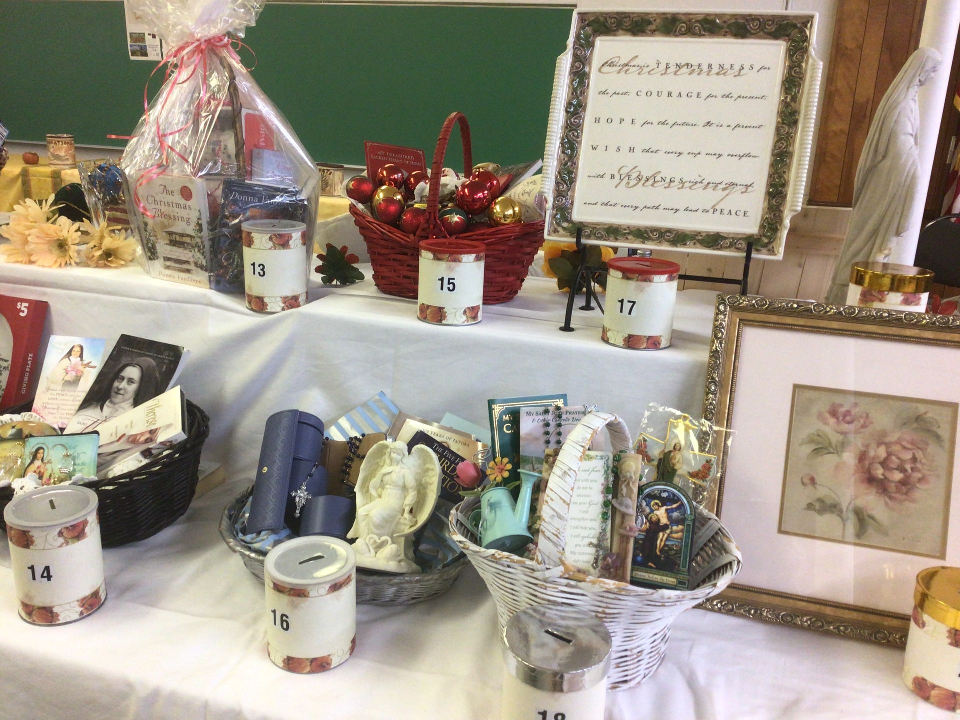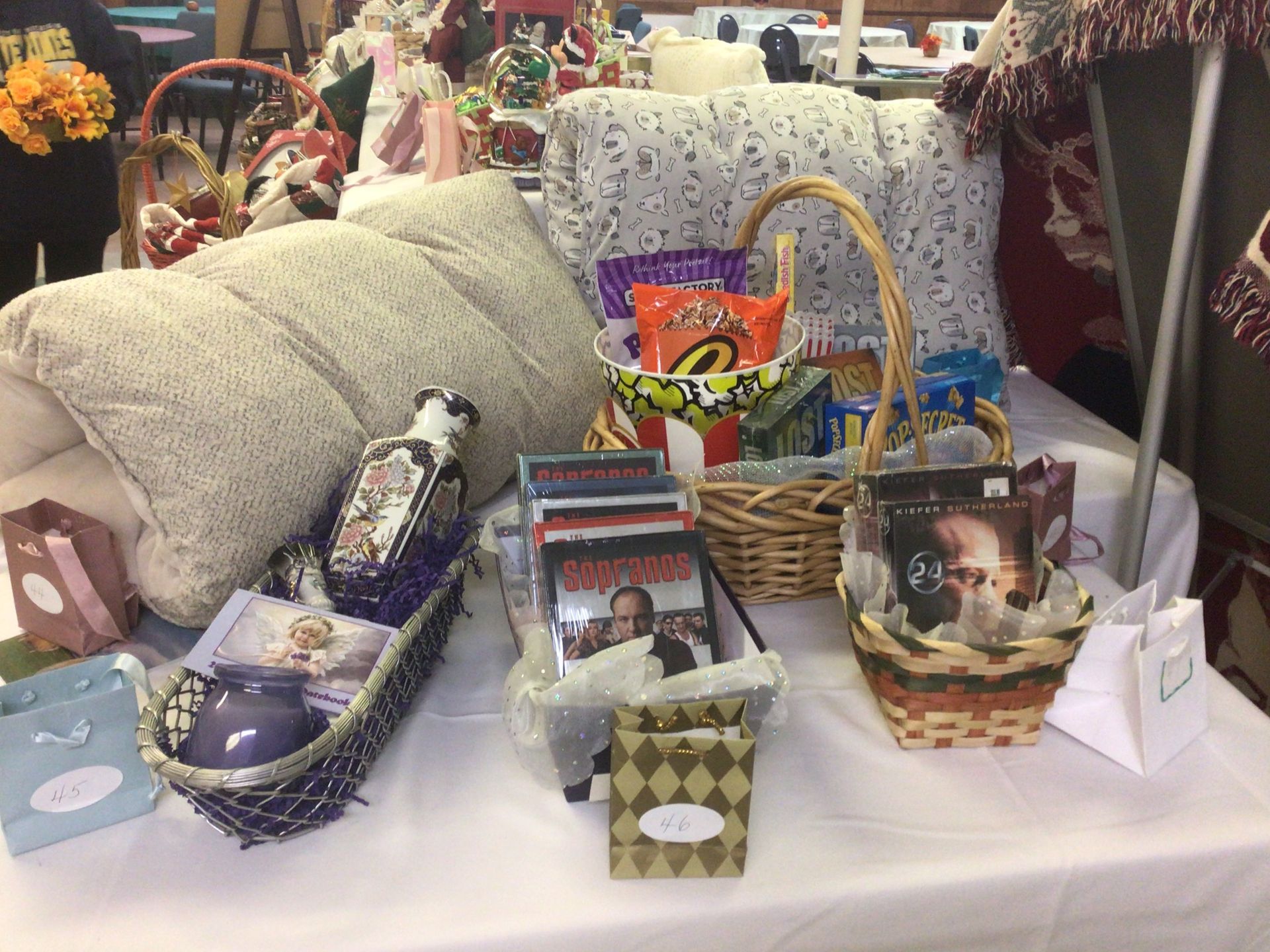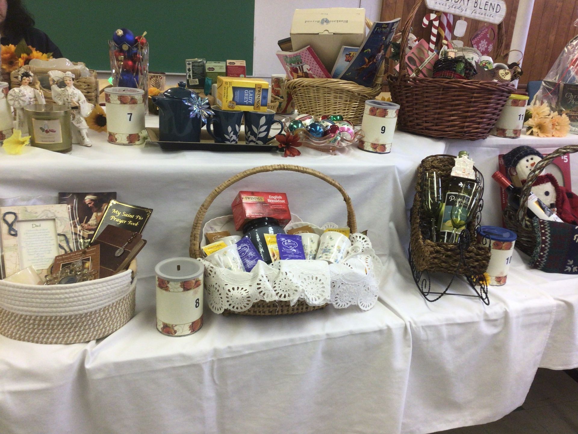 The Gift Basket Raffle includes 49 baskets including antiques, Christmas baskets, books, wine, and pet beds. Some are shown below: