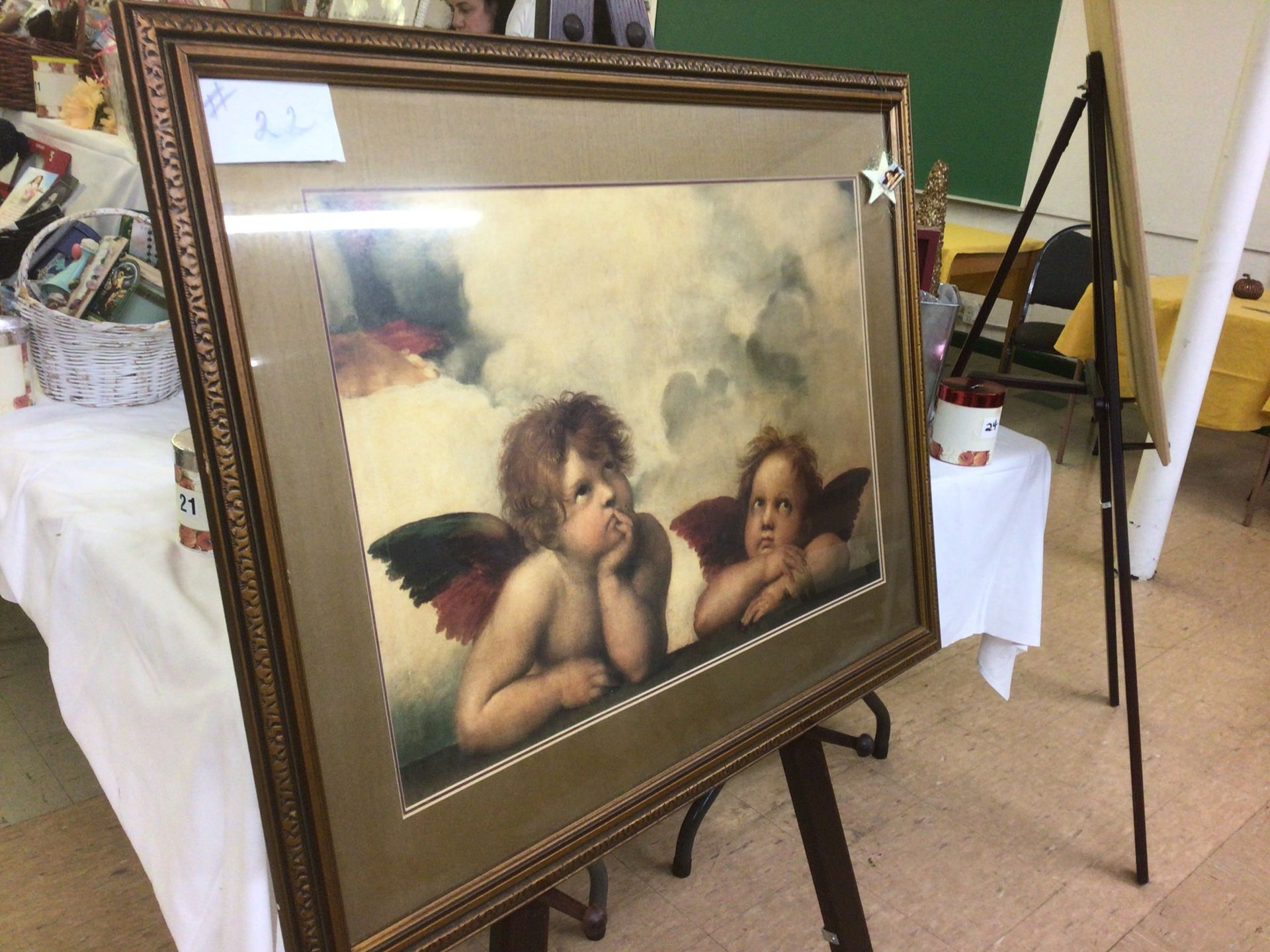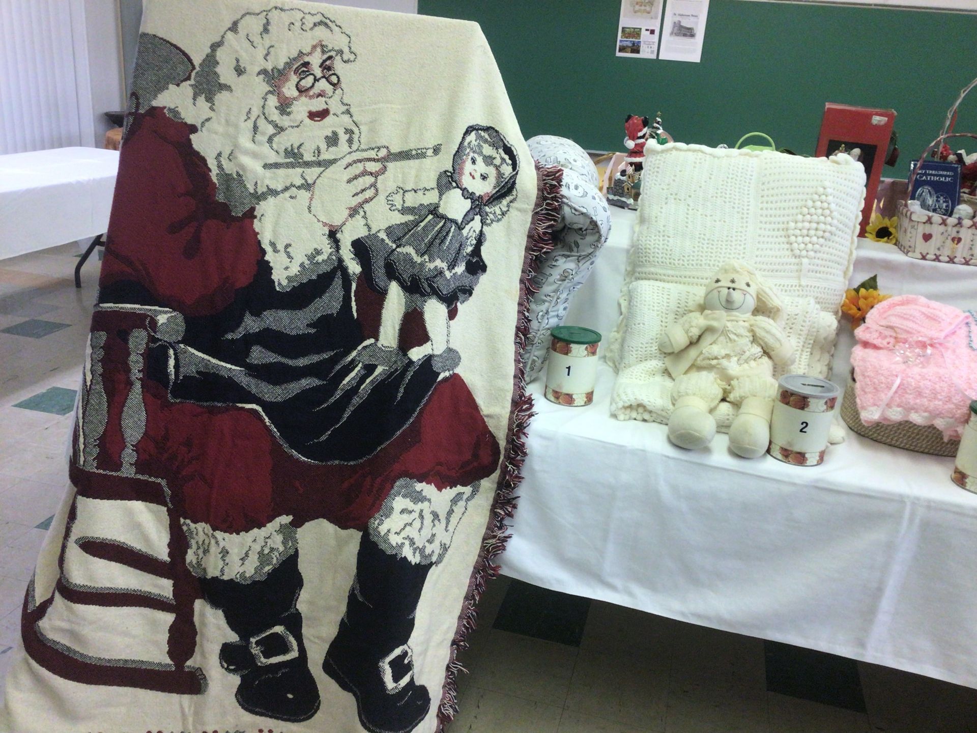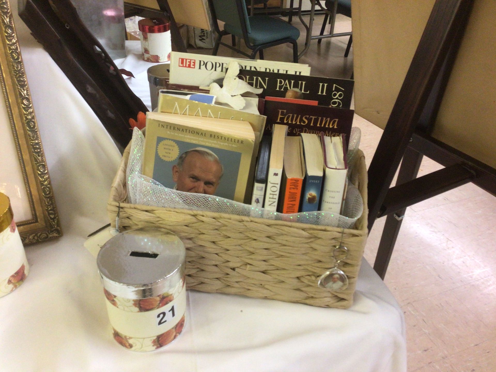 The Gift Basket Raffle includes 49 baskets including antiques, Christmas baskets, books, wine, and pet beds. Some are shown below: